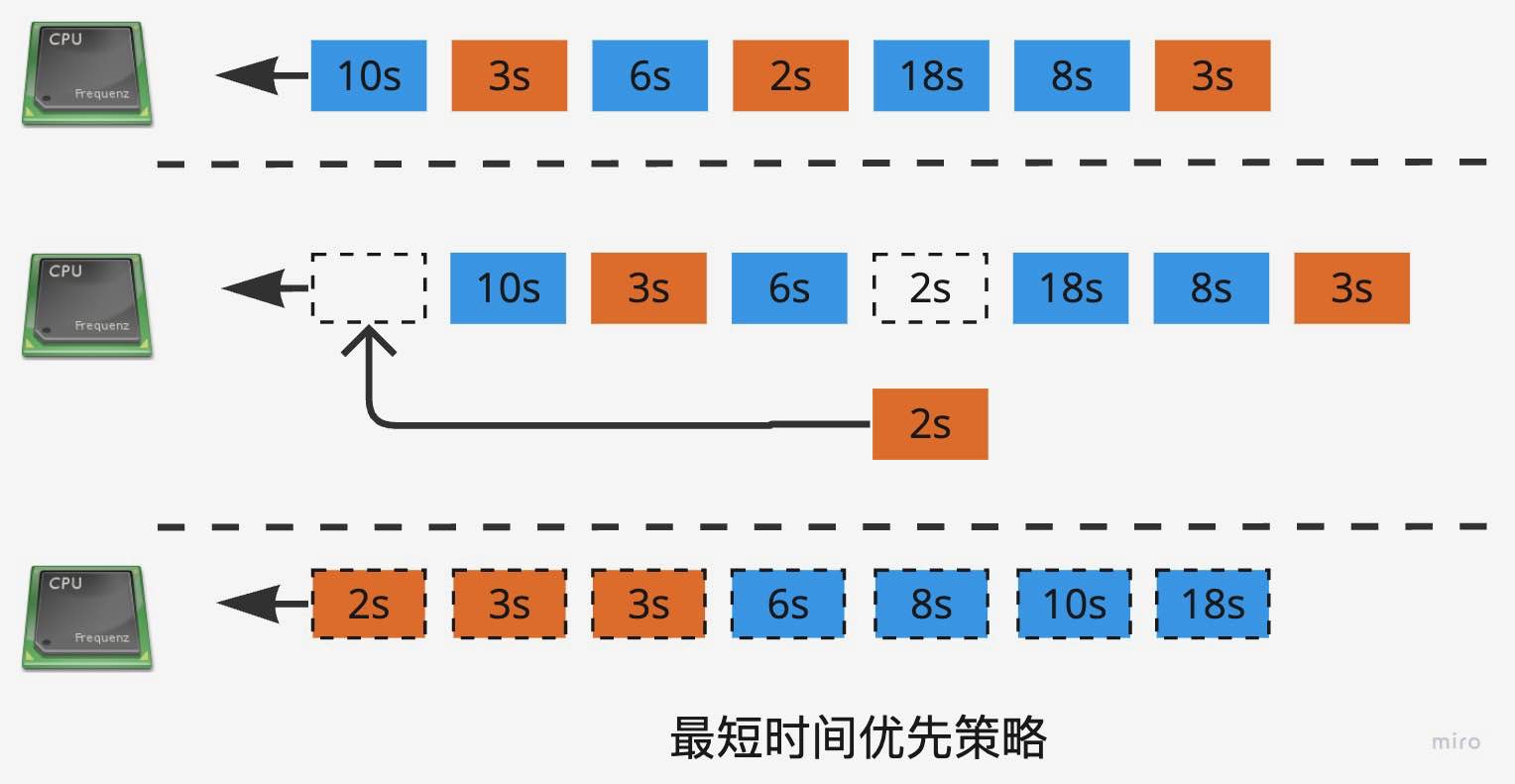 回到上面的例子,最优的调度策略诞生了,它就是最短时间优先,每次最短时间的任务优先执行,这样可以保证任务总等待时间最短。