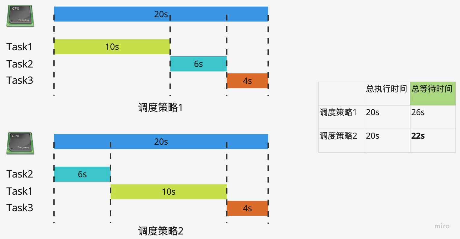 通过上面的例子可以看出,策略1和策略2的CPU总执行时间不变,但是等待时间变少了。也就是说调度系统帮我们减少了任务的总等待时间。超市里经常遇到排队的场景,当只买了少量的东西,和买大量东西的人排一队的时候,可能就会遇到等待时间过长的问题。