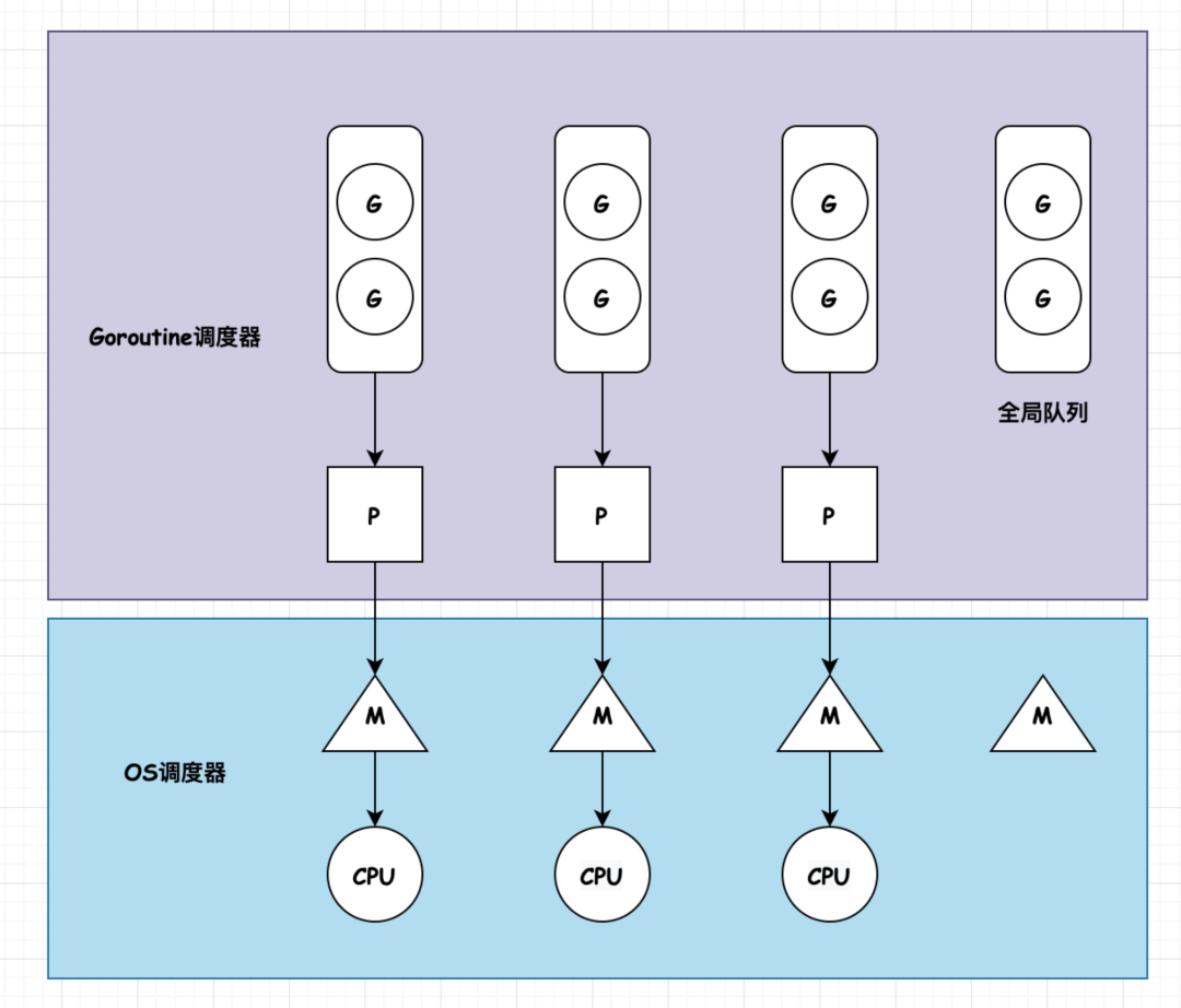 - M,Machine,表示系统级线程,goroutine 是跑在 M 上的。线程想运行任务就得获取 P,从 P 的本地队列获取 G,P 队列为空时,M 也会尝试从全局队列拿一批G放到P的本地队列,或从其他P的本地队列偷一半放到自己P的本地队列。M运行G,G执行之后,M会从P获取下一个G,不断重复下去。
