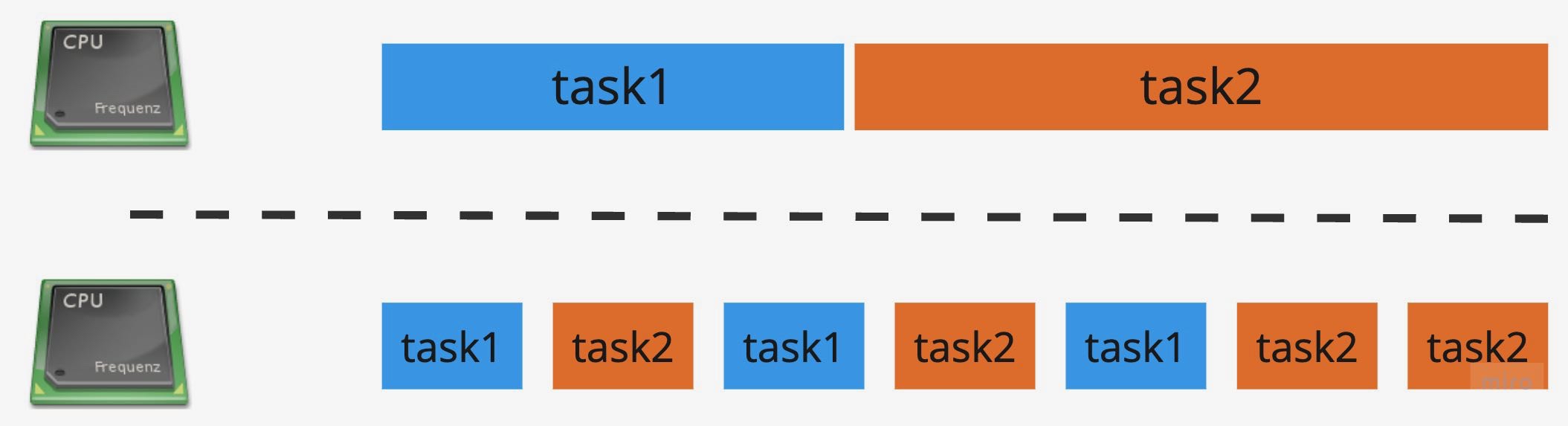 别灰心,有新的方法:时间片轮转。交替执行各个任务,每个任务分配一小段CPU时间,时间用尽则退出,让给其它任务使用。