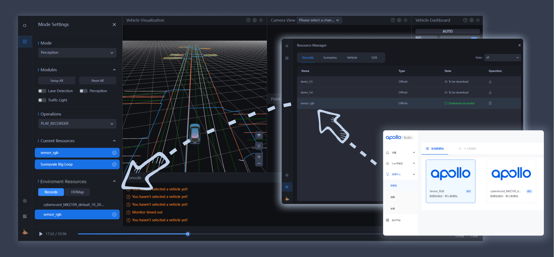 - 集成云端资源中心——取用更方便:数据资源集中,可便捷管理和迅速取用,同时进一步加强与 Studio 云端资源互动,可一键下载各类资源用于算法测试,包括地图、场景、车辆配置、数据包等,进一步丰富开发者资源库。